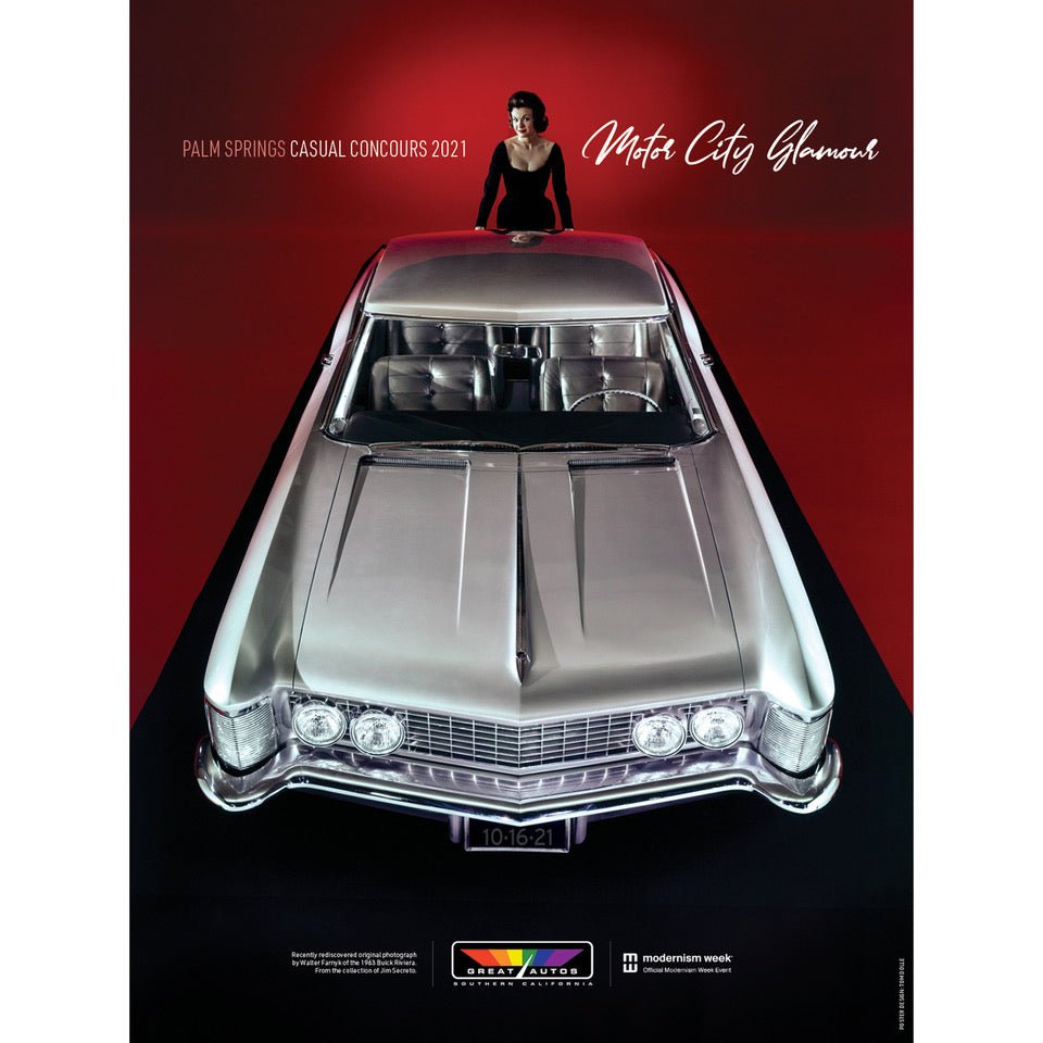 The poster was designed by Tom Dolle using a recently rediscovered image by celebrated midcentury car photographer Walter Farnyk of the 1963 Buick Riviera.