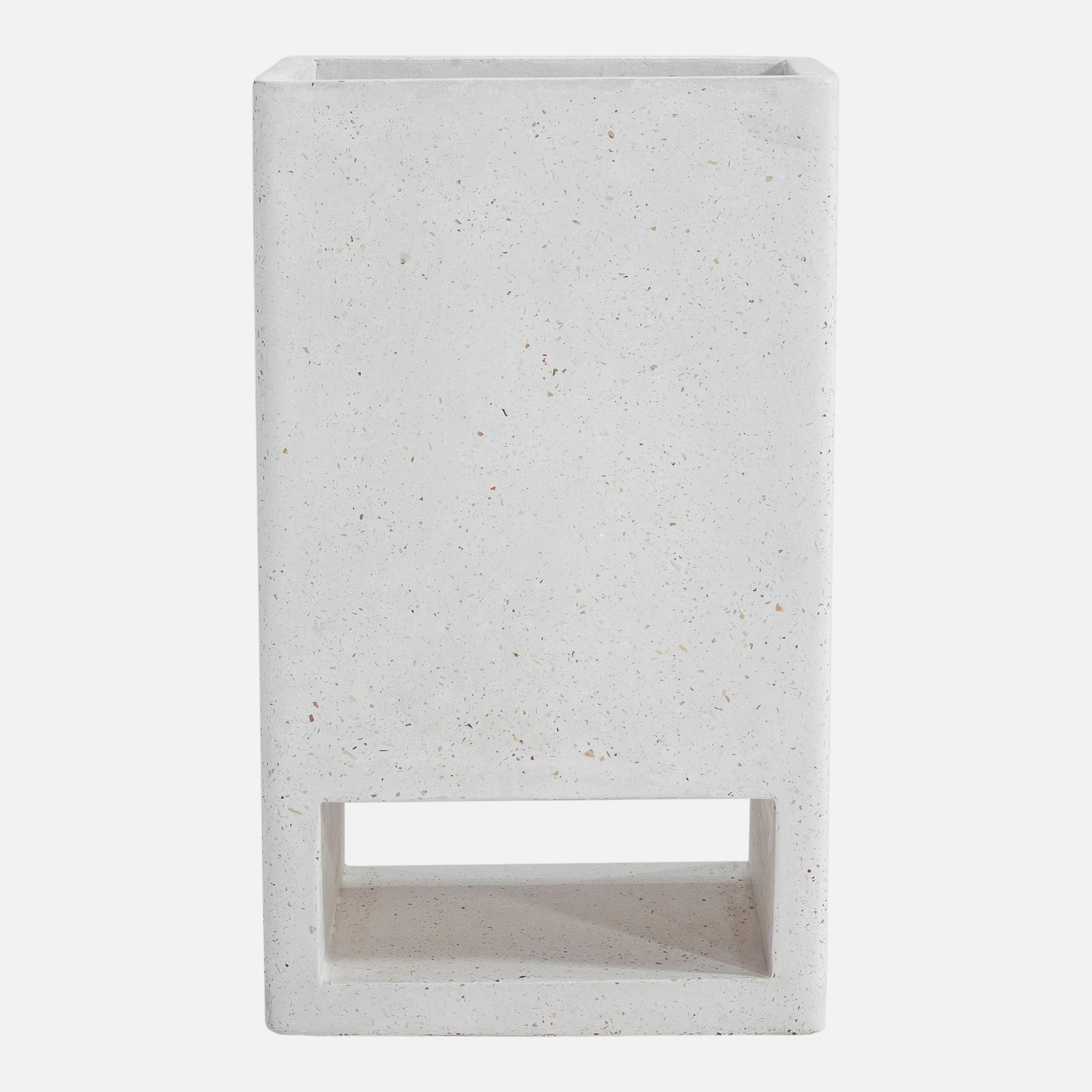 Stand-out style is set in stone. Prepare to create a stunning outdoor display with our head-turning Ivory Terrazzo Modular Planter. This gorgeous cement planter becomes a striking focal point when paired on either side of a front door to create a grand entrance. It would blend beautifully in a garden setting, adding texture and sophistication to natural surroundings. Of course, this substantial planter is equally lovely indoors. Made of light colored terrazzo, it has an organic aesthetic which appeals to contemporary and modern styles. With a unique sculptural look and feel, the Ivory Terrazzo Modular Planter adds elegance to any setting. Tall and rectangular with a unique cutout at the base, this magnificent planter is the ideal showcase for a selection of your favorite plants or herbs. It has drainage for easy watering and would look fabulous at home or along the waterfront at a lakeside cottage. The ivory terrazzo design features colored flecks for an additional touch of sophistication.