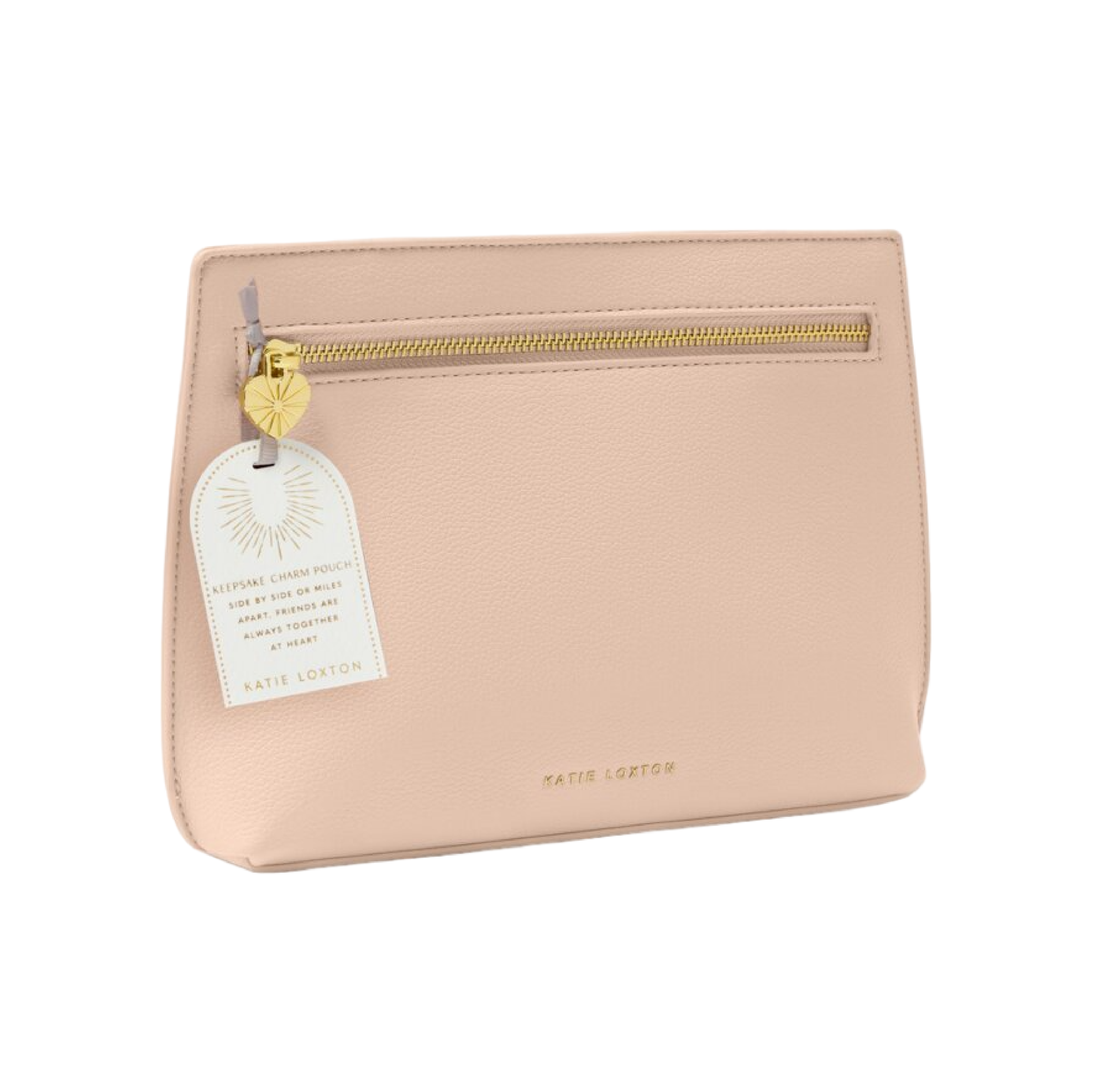 Katie Loxton’s charm pouch of the Keepsake Collection is crafted to be cherished. Made from supple vegan leather coloured nude pink, it features a click-on sentiment tag, roomy interior and gold-tone zip pull with a heart-shaped charm. Complete with a secret message on the inside and signature on the outside - Loxton’s charm pouch is designed for gifting.