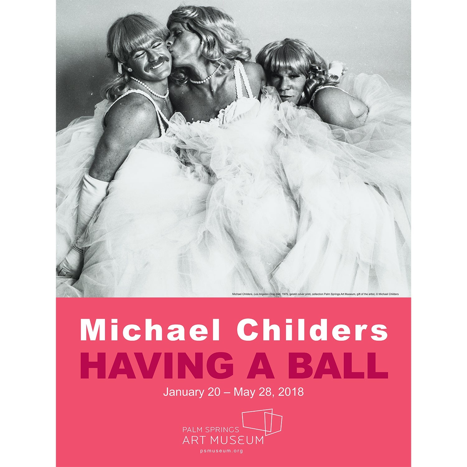 This original poster was created for the Palm Springs Art Museum's exhibit and features an original photograph by Michael Childers of three drag queens from the Los Angeles Ball in 1975.