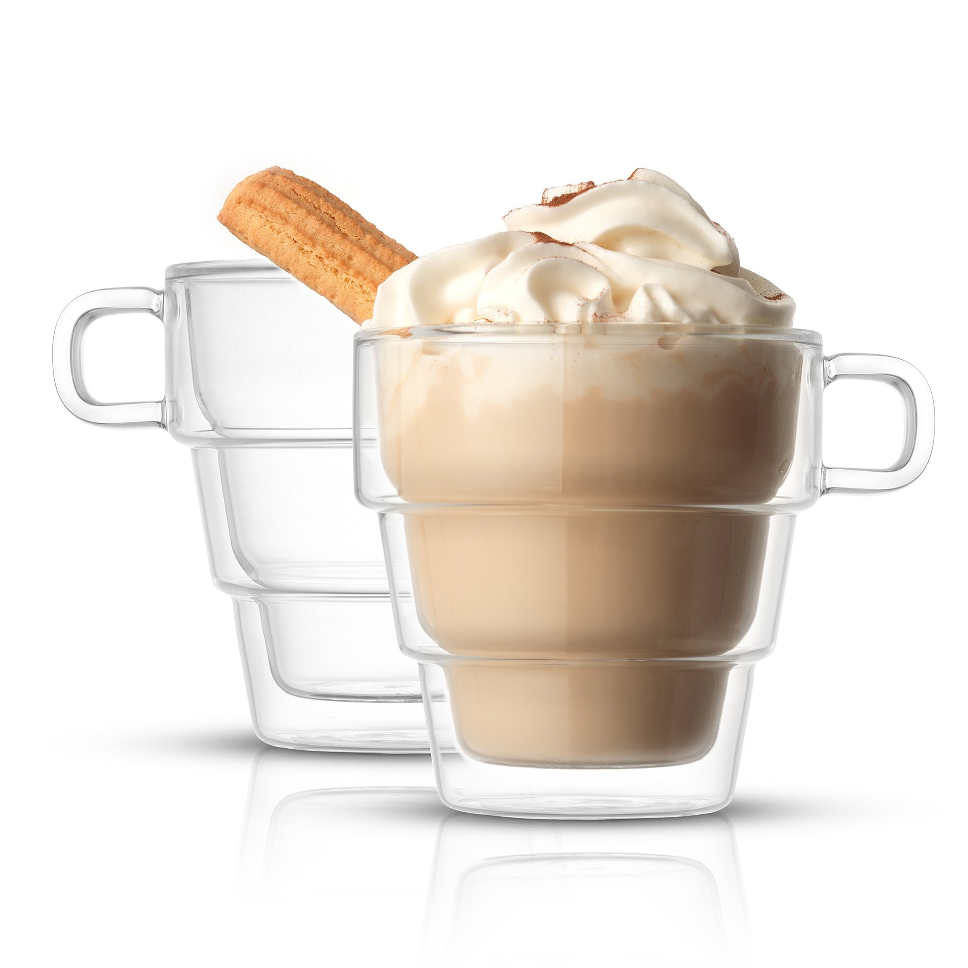 Craving a mug that keeps your latte steaming and your mornings a breeze? These coffee mugs, crafted from lead free glass, are double-walled to keep your drink perfectly hot (or refreshingly cold) while staying comfortable to hold. Stackable glasses means clutter-free cabinets, while the large, thick handle makes every sip a pleasure. Microwave and dishwasher safe, these versatile mugs are your coffee (or tea!) companions for any brewing adventure.